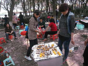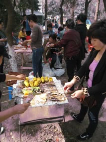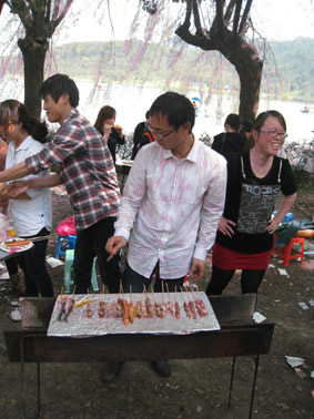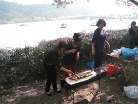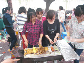 到达烧烤区找定位置后,各组人员纷纷拿出准备好的烧烤工具、各种烧烤菜肴等,忙的不可开交。不一会儿,有几组烧烤架上的食物已经可以食用了,各组组员迫不及待品尝着刚出炉的佳肴;有几组因为经验不足还把食物烤焦了,她们就派伙伴去别的组取经;有几组因为在锡纸上刷油刷太多,铺在烧烤架上的锡纸整个着起来了,吓得女同胞们四处逃窜。活动中的趣事实在太多太多,只有身在其中的人才能体会其中的乐趣。
